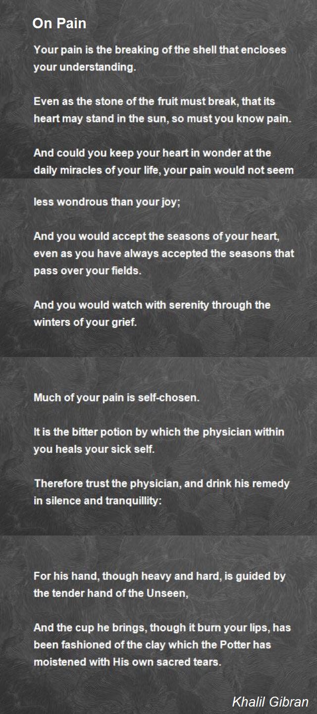 I’ve experienced pain throughout my life, both chronic and acute. This helps me to remember that there is something to be gained or learned from pain. But I’ve also learned that sometimes the pain is an indicator of self sacrifice and love, and sometimes it’s the voice of your conscience saying that you are doing the right thing. If only it came with a little discipline…doing the painful and right thing is tough, especially when making a choice. And sometimes, the choice is made for us, and there’s nothing we can do but muddle through it and take control of the little things in our life.